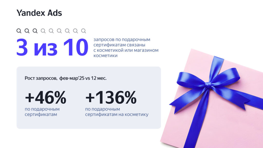 Три из десяти запросов о подарочных сертификатах связаны с косметикой или магазинами косметики. В феврале–марте число запросов о подарочных сертификатах на косметику на 136% выше среднего по году. Растёт интерес к спа-услугам (+27%), стайлерам (+35%), электрогрилям (+31%) и устройствам для ухода за собой (+25%).