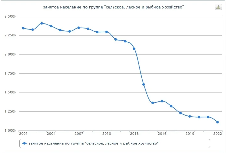 Например, количество занятого населения в сельском хозяйстве от года к году только падает. Между 2021 и 2022 годом разрыв составил почти 70 тысяч человек — масштаб небольшого казахстанского городка. Число наемных работников в группе группе «сельское, лесное и рыбное хозяйство» сократилось в 2022 году на 27,2 тысячи человек, а самозанятых — на 40,2 тысячи человек. Что можно толковать не иначе как — люди бегут из сельского хозяйства. Сомнительно, что эти человеческие ресурсы высвободились в результате технологической революции в АПК, учитывая последние данные о стремительном устаревании имеющегося у фермеров технического парка.