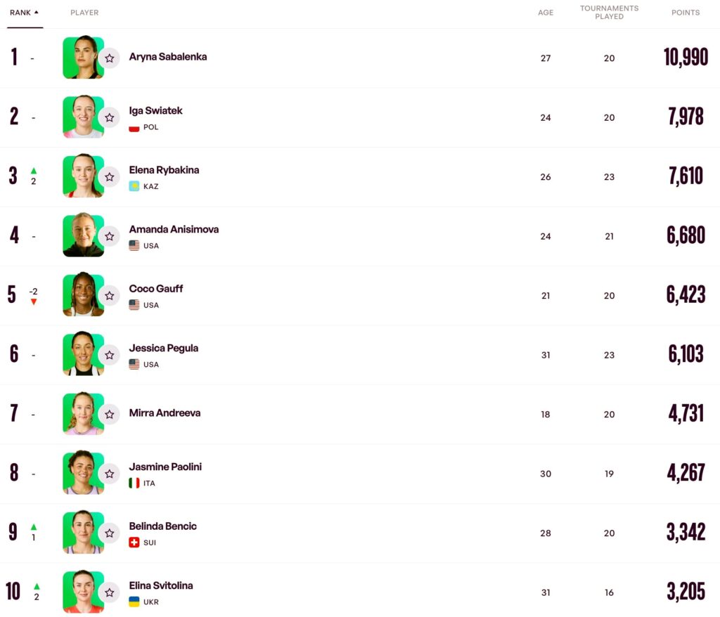 На первом месте финалистка австралийского «Шлема» Арина Соболенко из Беларуси, на втором представительница Польши Ига Швентек