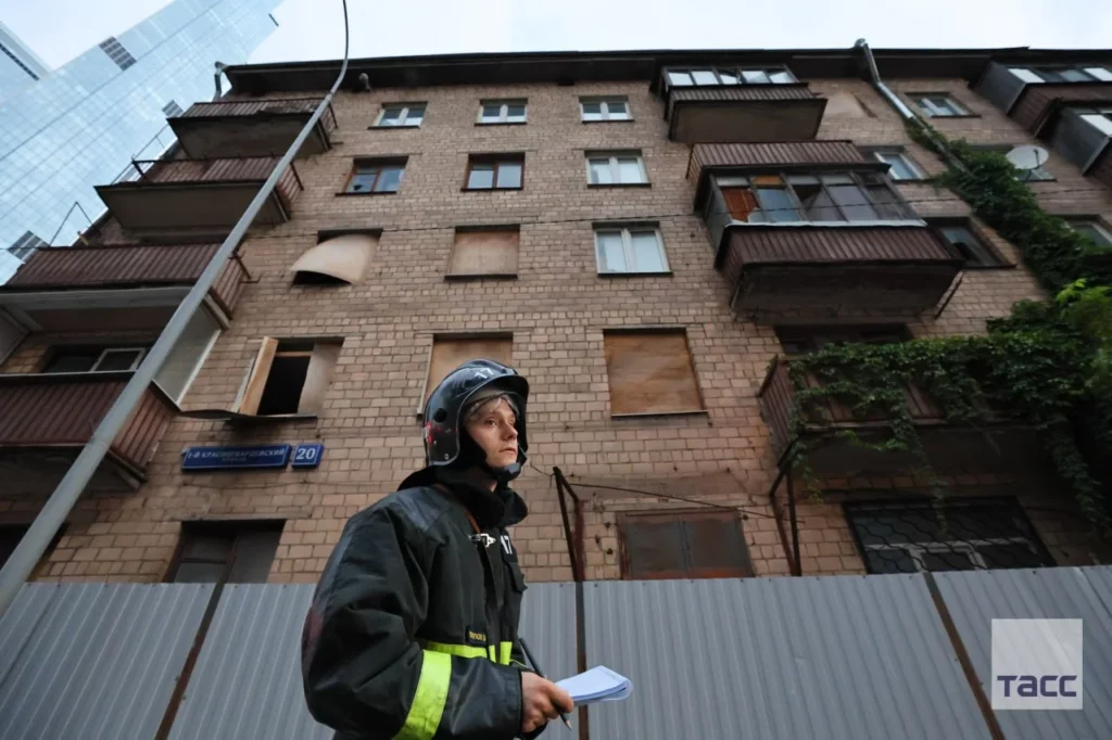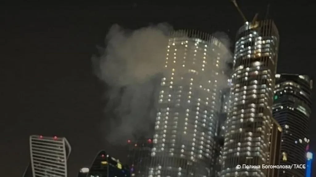 Один из дронов врезался в строящийся небоскреб Москва-Сити. Он повредил фасад и окна.