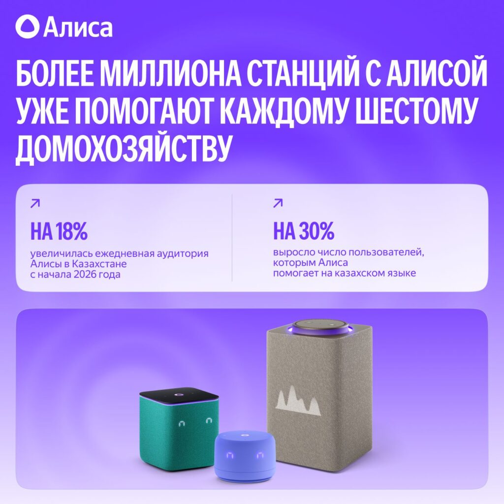 [1] Оценка рассчитана на основе соотношения количества активных умных колонок с Алисой и числа домохозяйств в Казахстане. Оценочное число домохозяйств получено как отношение численности населения страны по состоянию на 1 марта 2026 года к среднему размеру домохозяйства по данным Бюро национальной статистики Республики Казахстан.