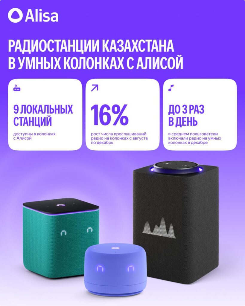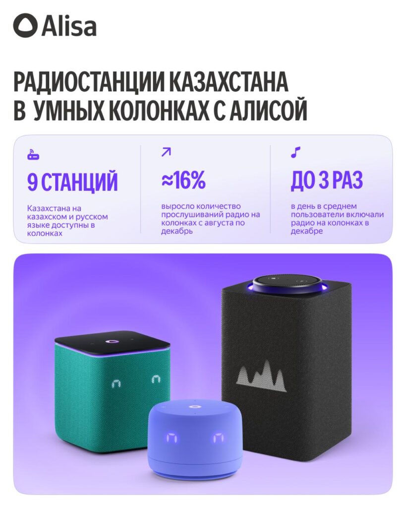 В умных колонках Yandex Qazaqstan с ИИ-ассистентом Алисой стали доступны эфиры казахстанских радиостанций Mustafin FM и Jibek Joly. Ранее пользователям в Казахстане были доступны Радио NS, Русское Радио Азия, Европа Плюс, Той Думан, Love Radio, Радио Дача и Авторадио Казахстан — а теперь к ним добавились ещё две локальные станции, и общее число доступных радиостанций выросло до девяти.